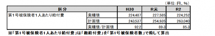 第1号被保険者1人あたり給付費について、第7期市介護保険事業計画(計画期間:平成30~令和2年度)で見込んだ計画値と実績値を比較すると、令和2年度の対計画比(実績値/計画値)が85.3%で乖離が見られます。第1号被保険者数は、おおむね計画どおりに進捗しているため、総給付費の乖離が主な要因と考えられます。